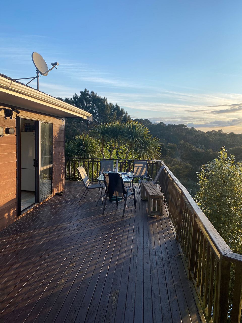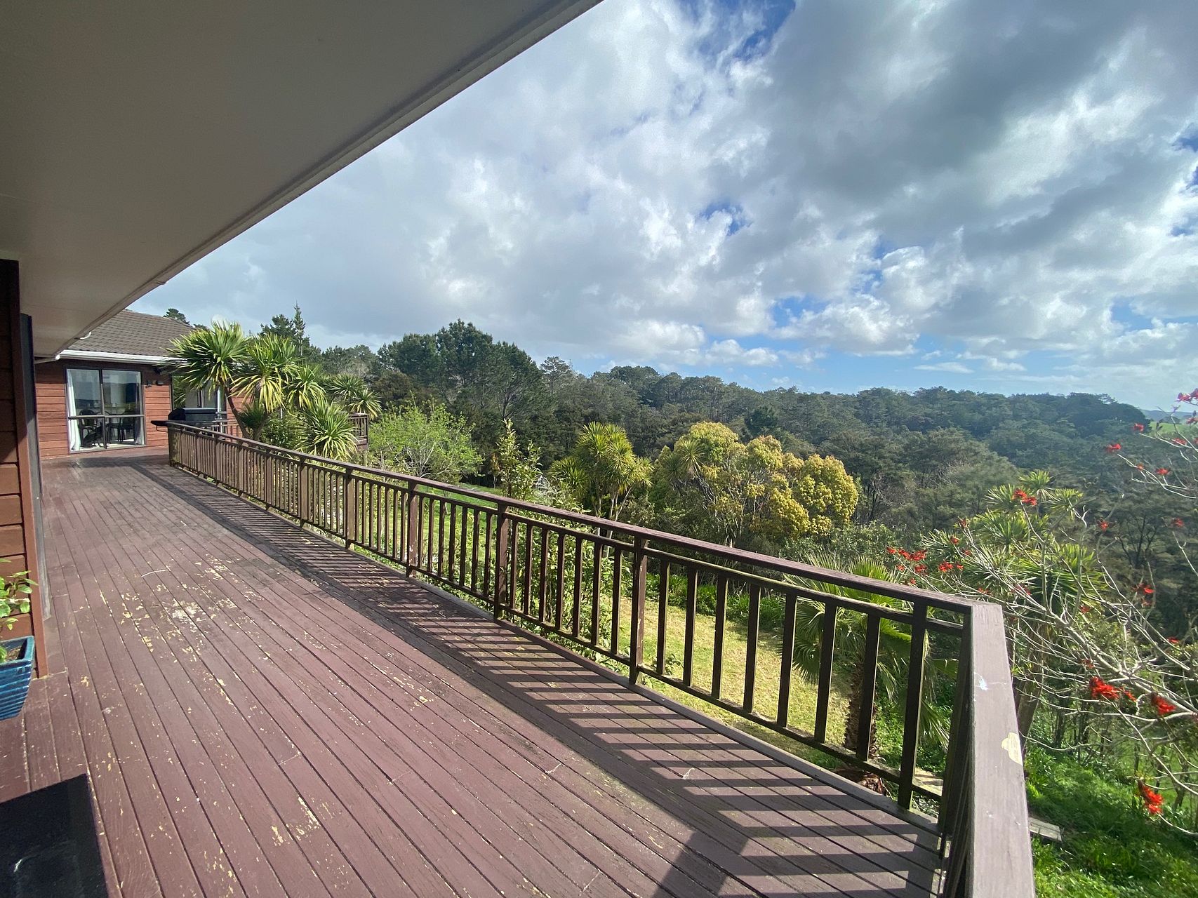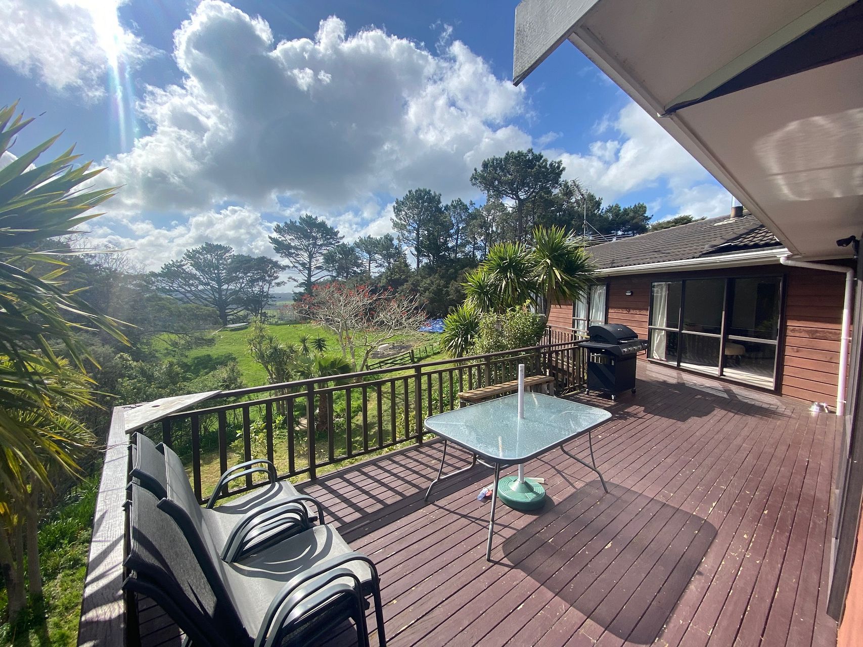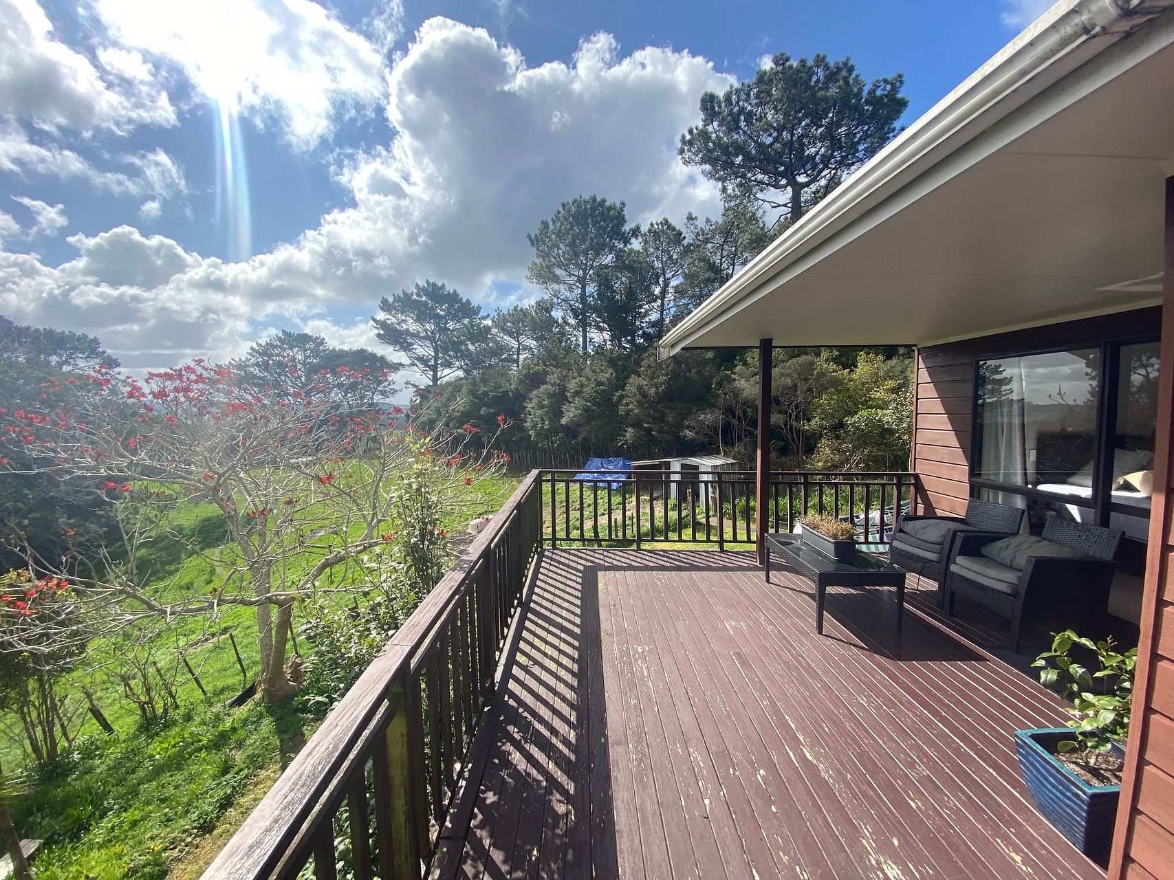 Spacious 250sqm family home on a 2ha lifestyle block in Dairy Flat, with stunning views and sunset over a huge wrap-around deck.
